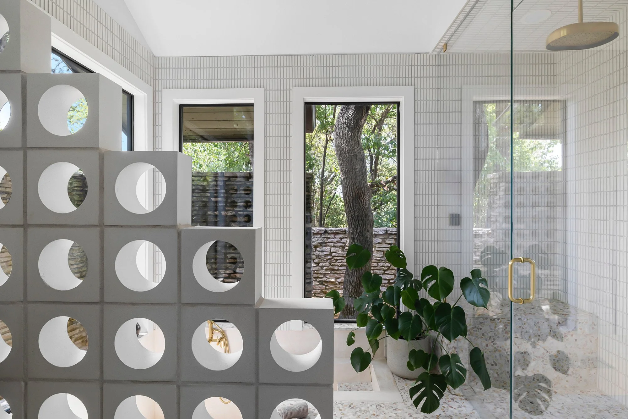 this 1970s home got a full scale renovation from redoven property solutions. the mid-century modern home was needing a new look but wanted to still have the homes original era shining through. luckily terrazzo is an obvious “yes!” for mid century modern design. the kitchen used our venice tiles that feature a marble, yellow & black chip which pairs perfectly with the black countertops. arguably our favorite part of the house is the bathroom, which used our trestles breezeblocks as a privacy wall which was paired with our venice terrazzo tiles.